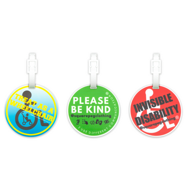 Square Peg provides Invisible Disability Bag Tags, Please be Kind and Treat As A Wheelchair Buggy Tags with handy clips that can be easily attached...